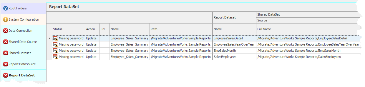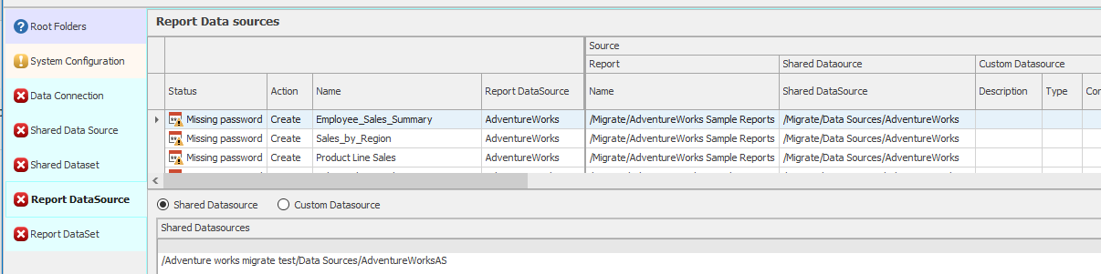 In the Shared Dataset tab you can see the source and destination locations for the shared datasets. Note the status is showing Missing Password as these datasets are linked to the AdventureWorks datasource. Entering the account details in the shared data source will fix the missing password in the screenshot below. The same applies to Report Data Sources and Report Data Sets.